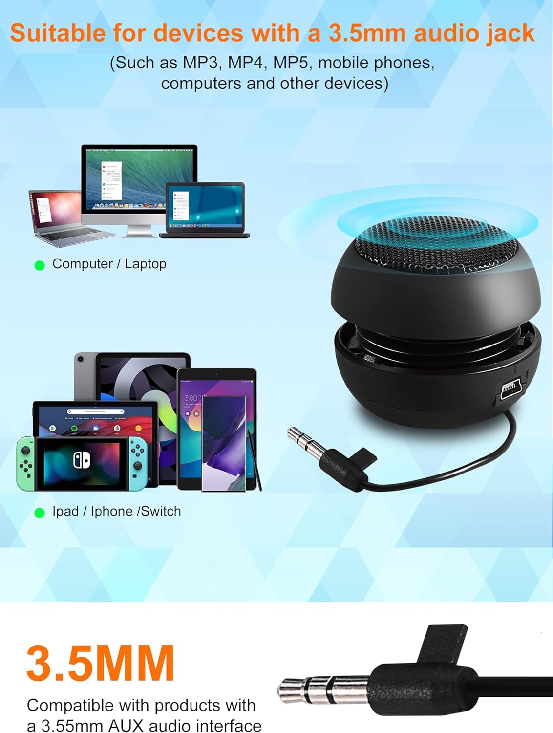 - 3.5mm audio jack: The Mini speakers suitable for MP3, MP4, MP5, cell phones, computers and other devices with 3.5mm audio jack