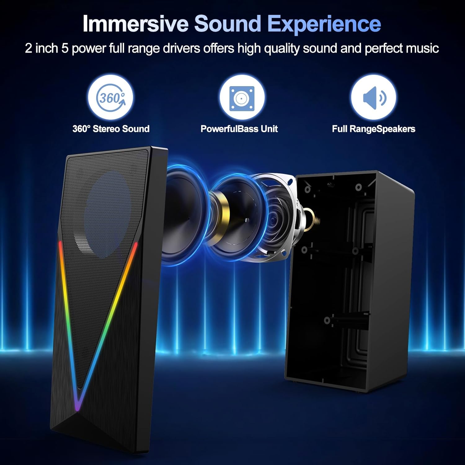 Desktop Speakers with Enhanced Bass, Volume Control & 6 Colorful Lights – USB & 3.5mm Aux Gaming Speakers for Laptop, PC, Tablet, Phone